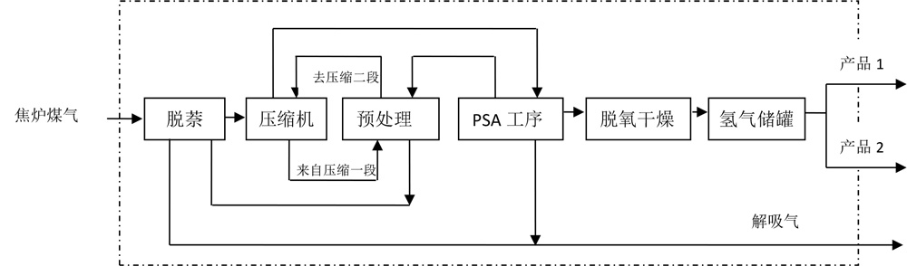 以廠區(qū)焦爐煤氣為原料氣,通過吸附分離工藝進行純氫的制取,本工藝技術(shù)方案流程簡單,全自動操作,穩(wěn)定可靠。即:脫萘工序、煤氣壓縮工序、預處理工序、PSA工序、氫氣脫氧干燥工序。